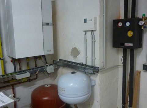 Die neue Anlagentechnik besteht aus einem Gas-Brennwertgerät und einer thermischen Solaranlage zur Warmwasseraufbereitung und Heizungsunterstützung. Die Wärmeübertragung erfolgt über Heizkörper.