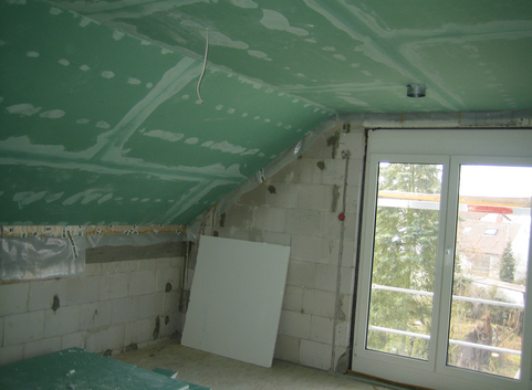 Die oberste Geschossdecke wurde mit 16 cm Mineralwolle (WLG 032) gedämmt. Der U-Wert der obersten Geschossdecke konnte von 1,35 W/(m²*K) auf 0,23 W/(m²*K) verbessert werden.