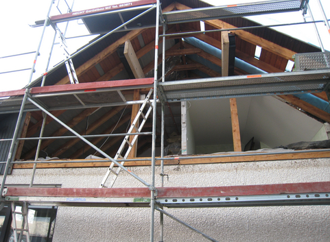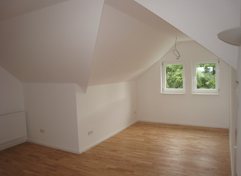 Die bestehende Zwischensparrendämmung aus 5 cm Glasfaser wurde im Schrägdach belassen. Zusätzlich wurde eine Aufsparrendämmung aus 12 cm Polyurethan (WLG 024) aufgebracht. Der U-Wert des Daches konnte von 0,52 W/(m²*K) auf 0,14 W/(m²*K) verbessert werden.