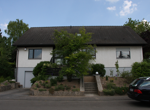 Die Außenwände aus Mauerwerk im Erdgeschoss und aus Leichtbeton-Fertigteilen im Obergeschoss waren bereits mit 5 cm Polystyrol beplankt. Zusätzlich wurde ein 16 cm dickes WDVS aus Polystyrol EPS (WLG 035) aufgebracht. Der U-Wert der Außenwände im Erdgeschoss konnte von 0,54 W/(m²*K) auf 0,16 W/(m²*K), im Obergeschoss von 0,50 W/(m²*K) auf 0,14 W/(m²*K) verbessert werden.