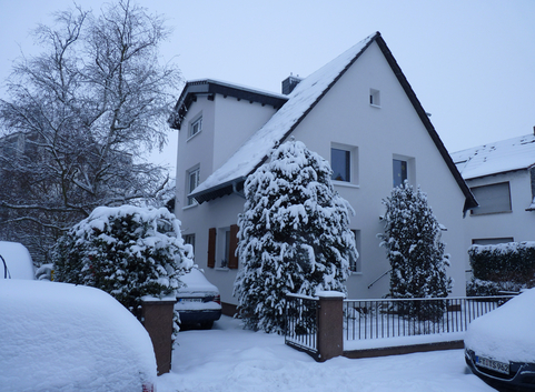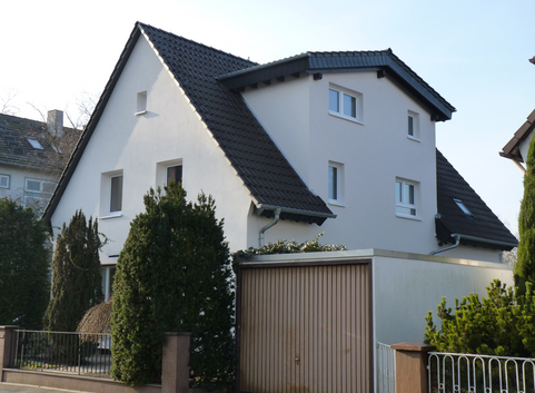 Die Außenwände aus 30 cm Mauerwerk wurden mit einem 14 cm dicken WDVS aus Polystyrol EPS (WLG 032) gedämmt. Der U-Wert der Außenwände konnte von 0,71 W/(m²*K) auf 0,17 W/(m²*K) verbessert werden. Die neuen Gauben im Dachgeschoss wurden aus Holzständerelementen gefertigt. Zwischen den Hauptträgern wurden 12 cm Mineralfaser (WLG 035) eingebracht. Außenseitig wurde zusätzlich mit 14 cm Polystyrol EPS (WLG 032) gedämmt. Der U-Wert beträgt 0,13 W/(m²*K