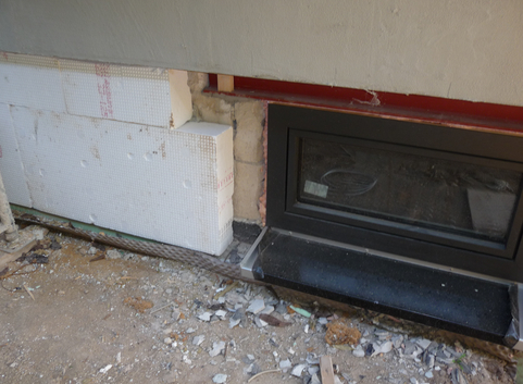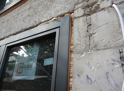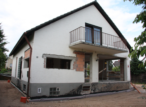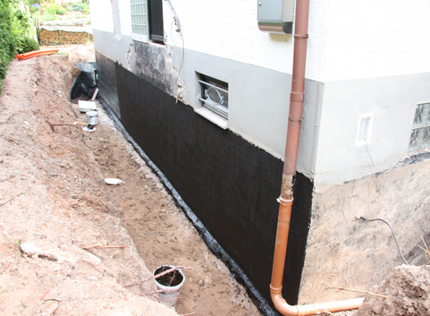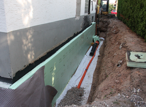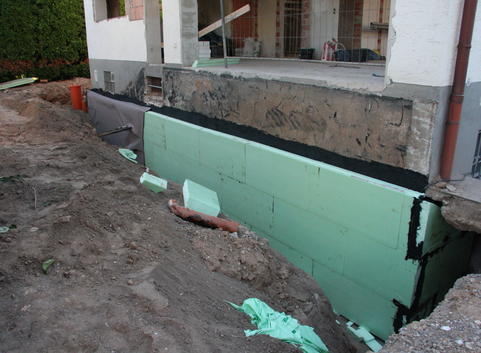 Außenseitig wurden die 30 cm starken Kellerwände aus Kalksandstein in erdberührten Bereichen mit einer 14 cm starken Dämmung aus Polystyrol XPS (WLG 035) und in Bereichen zur Außenluft mit einer 14 cm starken Dämmung aus XPS (WLG 035) gedämmt. Der U-Wert der Kellerwände konnte somit von 2.163 W/(m²*K) auf 0,23 bzw. 0.29 W/(m²*K) verbessert werden.