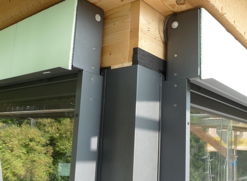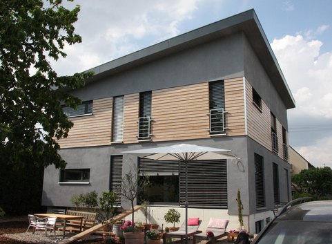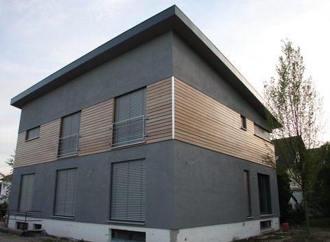 Die vorhandenen Erdgeschosswände wurden außenseitig mit 16 cm Steinwolle (WLG 036) gedämmt. Der U-Wert der Außenwände im EG konnte von 1.39 W/(m²*K) auf 0.186 W/(m²*K) verbessert werden. Das Obergeschoss wurde in Holzständerbauweise neu aufgestockt. Die Außenwandelemente wurden mit Zellulose (WLG 040) 24 cm ausgeblasen. Zum beheizten Raum hin wurden die Holzständerwände mit 5 cm dickem Thermohanf (WLG 040) ausgefacht. Diese Dämmschicht dient gleichzeitig als Installationsebene. Der U-Wert der Außenwände im OG beträgt 0.159 W/(m²*K) in den Bereichen mit Holzfassade. Die Außenwände mit Putz erreichen bei gleicher Dämmung einen U-Wert von 0.132 W/(m²*K).