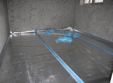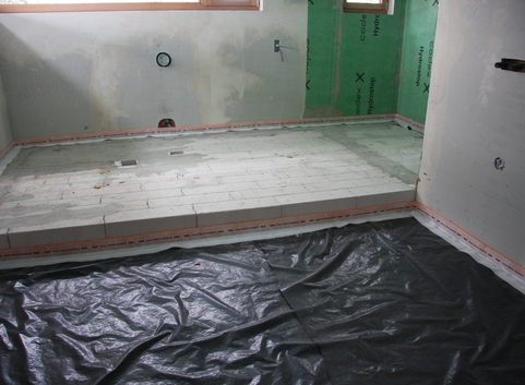 Die Bodenplatte wurde oberseitig mit einer 2 cm starken Dämmung aus EPS (WLG 035) gedämmt. Der U-Wert der Bodenplatte konnte von 3.76 W/(m²*K) auf 1.18 W/(m²*K) verbessert werden.