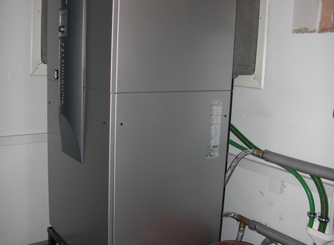 Es wurde eine Luft/Wasserwärmepumpe zur Warmwasseraufbereitung und Heizungsunterstützung eingebaut. Die Wärmeübertragung erfolgt über Fußbodenheizung.