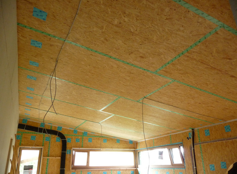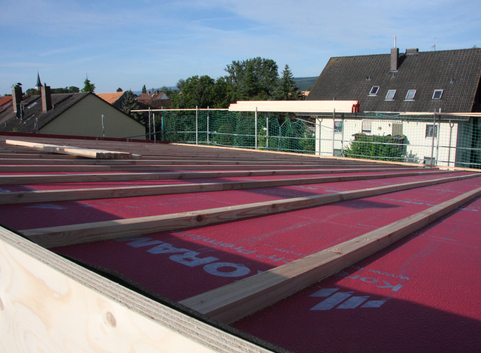 Der Dachstuhl wurde komplett zurückgebaut und durch ein Pultdach ersetzt. Als Zwischensparrendämmung wurde Zellulose (WLG 040) in einer Stärke von 30 cm eingeblasen. Die Aufsparrendämmung besteht aus einer 6 cm starken Holzfaserplatte (WLG 049).