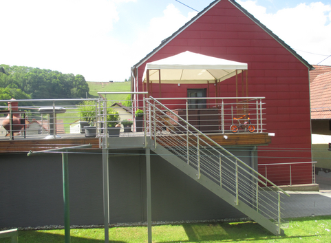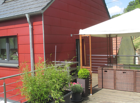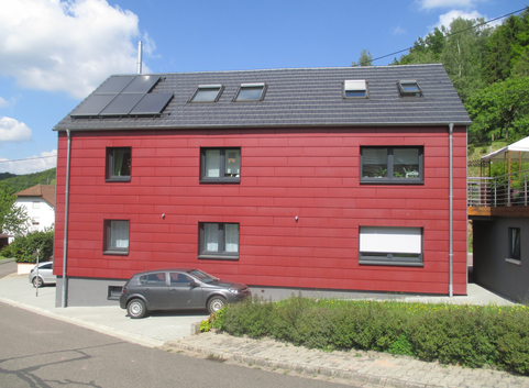 Die Außenwände wurde komplett mit einer vorgehängten, hinterlüfteten Fassade verkleidet. Die Aussendämmung besteht aus einer Holzkonstruktion, die mit Zellulose (WLG 040) 20 cm stark ausgeblasen wurde. Auf die Holzkonstruktion wurden 2 cm dicke Holzfaserdämmplatten (WLG 040) aufgebracht. Abschliessend wurden die Fassadenelemente aus Zementfaserplatten montiert. Der U-Wert der Außenwände konnte von 1,08 W/(m²*K) auf 0,170 W/(m²*K) verbessert werden.