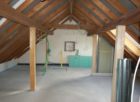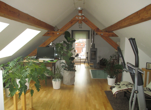 Das Dach wurde mit einer 20 cm Aufsparrendämmung aus Polyurethan (WLG 024) gedämmt. Vor der Sanierung stellte die oberste Geschossdecke, mit einem U-Wert von 0,82 bzw. 2,31 W/(m²*K), ein Teil der Gebäudehüllfläche dar. Nach der Sanierung ist der U-Wert der Dachfläche maßgebend. Der U-Wert beträgt 0,12 W/(m²*K).