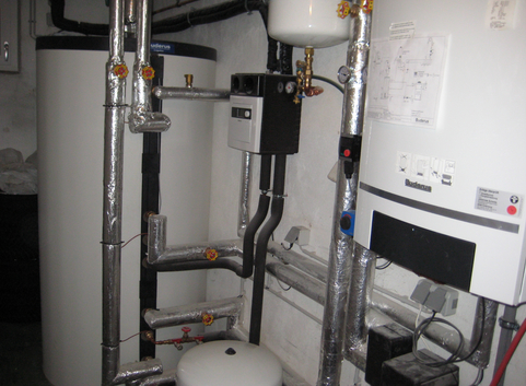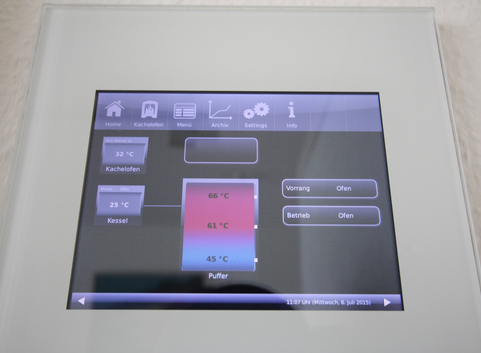 Als Heizungsanlage wurde ein Gas-Brennwertkessel installiert, der von einer solarthermischen Anlage unterstützt wird. Zusätzlich wurde im Wohnraum ein Kaminofen mit Wassertasche eingebaut.