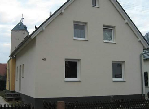 Die Außenwände aus Bimsstein und Kalksandstein wurden mit 23 cm EPS gedämmt. (WLG 035, U-Wert = 0,13/0,14 W/(m²K))