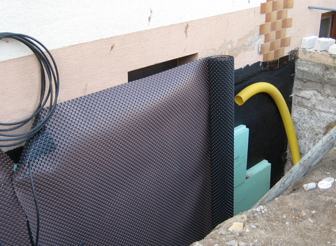Die Kellerwände aus Betonmauersteinen wurden zum Erdreich mit 10 cm Polystyrol Hartschaumplatten gedämmt. (WLG 040, U-Wert = 0,31 W/(m²K))