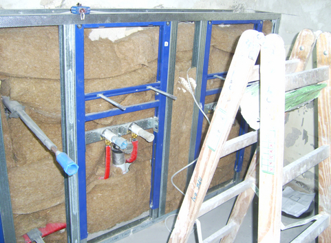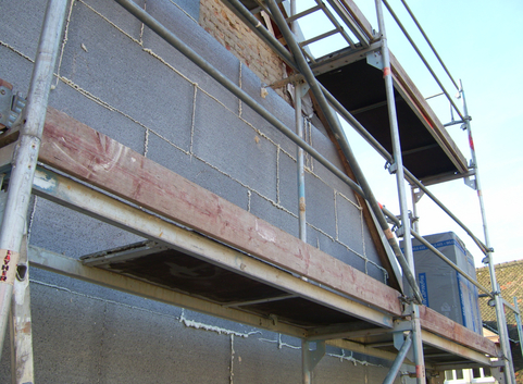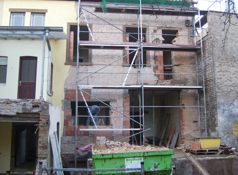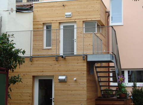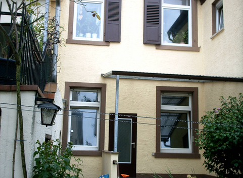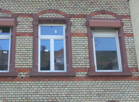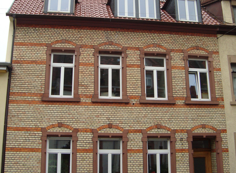 Die Außenfassade zur Straße ist mit 12 cm starken Klinkern verkleidet. Um die denkmalgeschützte Fassade zu erhalten, wurde das 24 cm dicke Ziegelmauerwerk innenseitig mit 10 cm dicken Mineraldämmplatten (WLG 045) versehen. Der U-Wert der Außenwand konnte von 1,65 W/(m²*K) auf 0,36 W/(m²*K) verbessert werden. Die Außenwand zur Gartenseite aus 36,50 cm dicken Vollziegeln wurde mit einem 16 cm starken WDVS aus Polystyrol (WLG 035) gedämmt. Der U-Wert der Außenwand konnte von 1,45 W/(m²*K) auf 0,19 W/(m²*K) verbessert werden