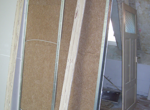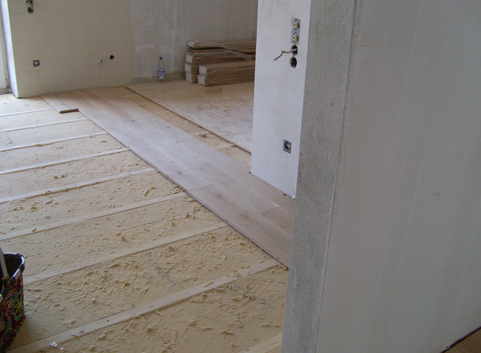 Die Kellerdecke wurde oberseitig mit zwei Lagen je 6 cm starken Holzfaserplatten (WLG 040) gedämmt. Der U-Wert der Kellerdecke konnte von 0,76 W/(m²*K) auf 0,29 W/(m²*K) verbessert werden.