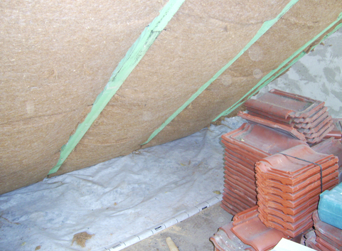 Die im Dach bereits vorhandene 12 cm starke Zwischensparrendämmung aus Mineralfaser (WLG 035) wurde durch eine Untersparrendämmung aus 10 cm Thermohanf (WLG 040) ergänzt. Der U-Wert des Daches konnte von 0,38 W/(m²*K) auf 0,23 W/(m²*K) verbessert werden.