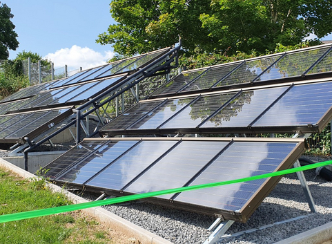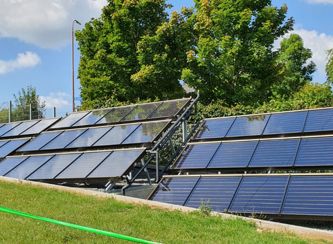 Die von der Solaranlage bereitgestellte Energie wird im ersten Schritt in zwei 1.500 Liter Pufferspeicher eingespeist. Dadurch kann genügend Wärme vorgehalten werden, um über eine Frischwasserstation ausreichend Warmwasser für die Duschen zur Verfügung zu stellen. Für den Fall, dass nicht genügend Solarenergie zur Verfügung steht und zur thermischen Desinfektion ist ein elektr. Heizstab vorhanden. Dieser kann bei Bedarf die fehlende Temperaturdifferenz zwischen Puffertemperatur und gewünschter Warmwassertemperatur ausgleichen. Die Technik wurde auf durchschnittlich 100 Duschen pro Tag ausgelegt und erreicht nach der Simulation einen solaren Deckungsanteil von 67 %. Die konstante Warmwasserbereitstellung und somit der bestimmungsgemäße Betrieb der Trinkwasseranlage ist also nicht nur gewährleistet, sondern wird auch zu zwei Dritteln aus regenerativer Sonnenenergie gedeckt.