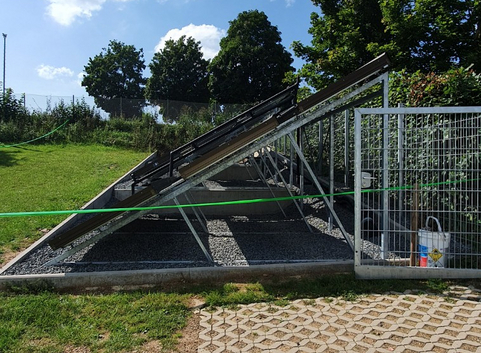Die Solarthermieanlage wurde ähnlich wie PV-Freiflächenanlagen im Gelände aufgeständert. Grund hierfür ist, dass bereits alle Dächer mit der Solarabsorberanlage belegt sind und diese aufgrund des guten Zustandes in dieser Form weiterbetrieben wird. Zur Sicherung der Anlage, aber auch zum Schutz der Besucher, vor allem von Kindern, wird die Anlage noch eingezäunt. Die Leitungen vom Kollektorfeld bis in die Technikzentrale sind in der Erde verlegt. Unter anderem konnte dadurch die Zufahrt von der Straße auf das Schwimmbadgelände beibehalten werden.