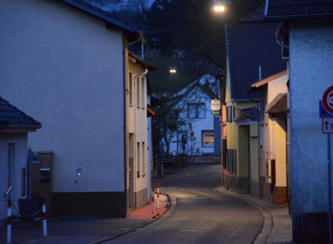 Für die Straßenbeleuchtung wurde die Farbtemperatur 3000k und Leuchten mit geringer Lichtstreuung ausgewählt. Die Beleuchtungsstärke wird in den Nachtstunden um ca. 50% reduziert.