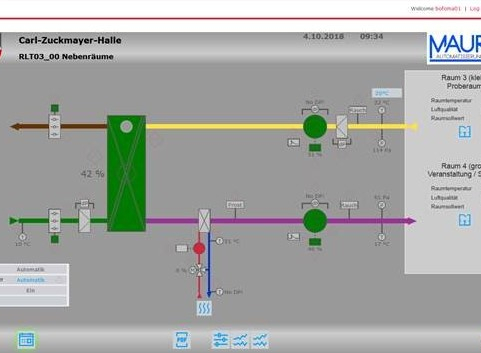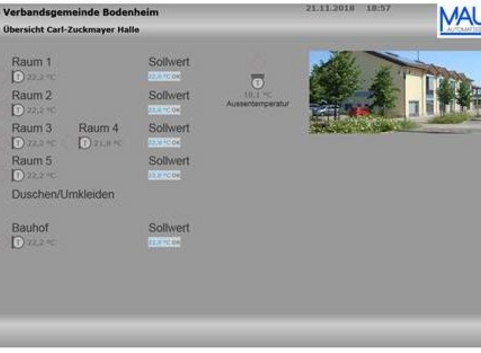 Das Energiemanagement der Verbandsgemeinde Bodenheim ist ein langfristiges Projekt, das kontinuierlich weiterentwickelt wird. So wurde im Jahr 2015 ein überdurchschnittlicher Energieverbrauch der Carl-Zuckmayer-Halle festgestellt. Im Rahmen der Modernisierungsmaßnahmen wurde die Liegenschaft mit einer Gebäudeleittechnik (GLT) mit Energiemonitoring ausgestattet. Seitdem ist die GLT ein zentraler Bestandteil des Energiemanagements in der Verbandsgemeinde Bodenheim. Aufgrund der guten Erfahrungen wird in allen neuen Liegenschaften der Verbandsgemeinde Bodenheim dieses System verbaut. Es umfasst die intelligente Steuerung und Überwachung der technischen Anlagen und des Energieverbrauches in den Liegenschaften. Mithilfe einer zentralen Steuerungssoftware werden Heizungs- und Lüftungssysteme optimiert betrieben, um den Energieverbrauch zu minimieren. Vor Ort können die Anlagen über eine DDC (Direct-Digital-Controler) gesteuert werden, von dem aus die Daten auch an die GLT der Firme Delta Controls übermittelt werden. Die Datenübertragung erfolgt hierbei über VPN-Tunnel, um einen externen Datenzugriff zu verhindern. In der GLT werden die Daten dann durch graphische Anwenderbilder dargestellt, sodass die Bedienung in der Nutzerebene leicht verständlich ist. Die Energiedaten werden zusätzlich in separaten Grafiken dargestellt und können z.B. einfach graphisch mit den Daten des Vorjahres verglichen werden.