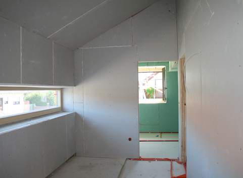 Das Pultdach wurde zwischen den Sparren mit 36 cm Zellulose (WLG 040) ausgeblasen und zusätzlich mit einer Aufsparrendämmung aus einer 1.60 cm dicken Holzfaserplatte (WLG 090) versehen. Der U-Wert des Daches beträgt 0.13 W/(m²*K).