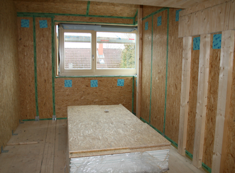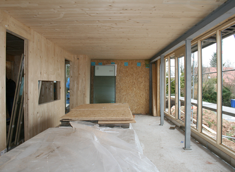 Die Außenwände aus 36 cm starken Holzständerelementen wurden mit Zellulose (WLG 040) ausgeblasen. Die Holzständerkonstruktion wurde zusätzlich mit einer 4 cm dicken Holzfaserplatte (WLG 045) gedämmt. Der U-Wert der Außenwand beträgt 0.11 W/(m²*K).