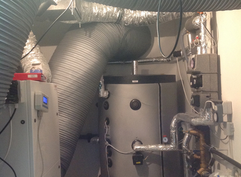 Zur zentralen Be- und Entlüftung sowie zur zentralen Warmwasserbereitung und Wärmeversorgung wurde ein Kompaktgerät (Luft-/Wasser-Wärmepumpe mit Wärmerückgewinnung) eingebaut. Die Wärmerückgewinnung beträgt effektiv > 75 %. Die Wärmeübertragung erfolgt über Fußbodenheizung. Ein Holzofen dient der Heizungsunterstützung.