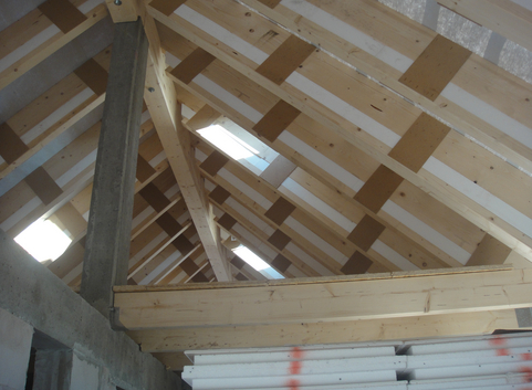 Die Konstruktion des Satteldaches wurde mit thermisch getrennten Sparren ausgeführt. Die Trennung erfolgt durch 6 cm Mineralwolle (WLG 035). Die Zwischensparrendämmung wurde ebenfalls mit Mineralwolle (WLG 035) in einer Stärke von 34 cm ausgeführt. Als Untersparrendämmung wurden 10 cm Polystyrol (WLG 040) eingebaut. Der U-Wert des Daches beträgt 0.09 W/(m²*K).
