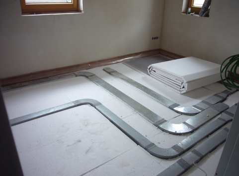 Die Bodenplatte wurde unterseitig und die Fundamente umlaufend mit 16 cm Polystyrol XPS (WLG 035) gedämmt. Oberseitig wurde eine 6 cm dicke Trittschalldämmung (WLG 035) aus Polystyrol XPS aufgebracht. Der U-Wert der Bodenplatte beträgt 0.15 W/(m²*K).