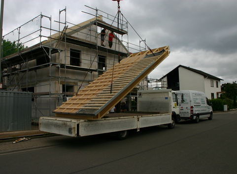 Das Satteldach wurde zwischen den 40 cm hohen Sparren mit Dämmung (WLG 040) ausgefacht. Zusätzlich wurde als Aufsparrendämmung eine 1.6 cm dicke Holzfaserplatte (WLG 090) aufgebracht. Der U-Wert des Daches beträgt 0.11 W/(m²*K).