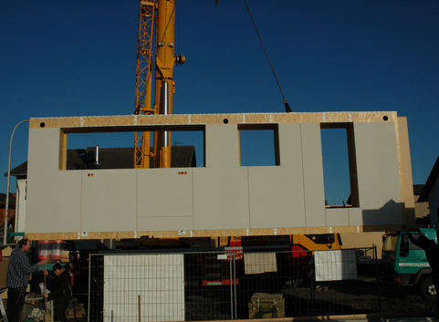 Die Außenwände des Gebäudes wurden aus vorgefertigten Holzständerelementen mit vorgehängter Holzfassade erstellt. Die Elemente wurden mit 36 cm Zellulose (WLG 040) ausgefacht. Außenseitig wurden die Elemente mit einer 1.5 cm dicken Holzfaserplatte (WLG 080) beplankt. Der U-Wert der Außenwand beträgt 0.11 W/(m²*K).