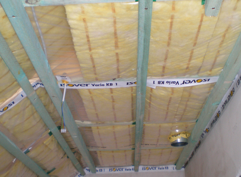 Die oberste Geschossdecke wurde wie das Steildach mit einer Zwischensparrendämmung von 20 cm Mineralfaser (WLG 035) und einer zusätzlichen 5 cm (WLG 035) Untersparrendämmung ausgeführt. Der U-Wert beträgt 0.16 W/(m²*K).