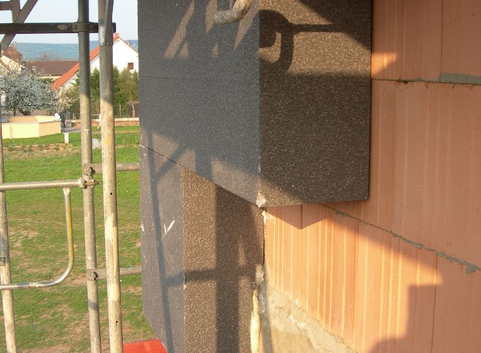 Die Außenwände bestehen aus 24 cm dickem Porotonmauerwerk. Außenseitig wurde ein 20 cm dickes WDVS aus Polystyrol (WLG 032) aufgebracht. Der U-Wert der Außenwand beträgt 0.12 W/(m²*K).