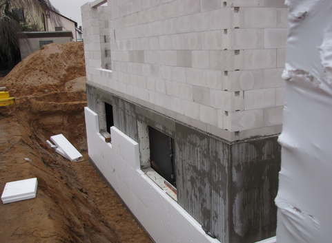 Die erdberührten Bauteile aus Stahlbeton wurden mit 10 cm Perimeterdämmung (WLG 035) versehen. Der U-Wert der Kellerwand beträgt 0.32 W/(m²*K).
