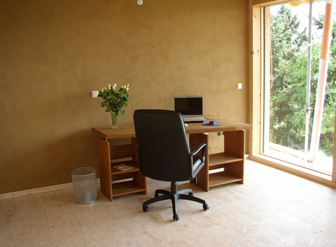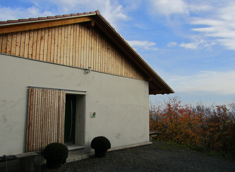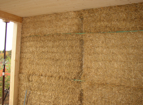 Die Außenwände des Gebäudes bestehen aus 75 cm hochdruckgepressten Stroh-Quader-Ballen. Der U-Wert der Außenwand beträgt 0,098 W/(m²*K).