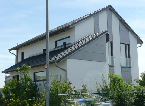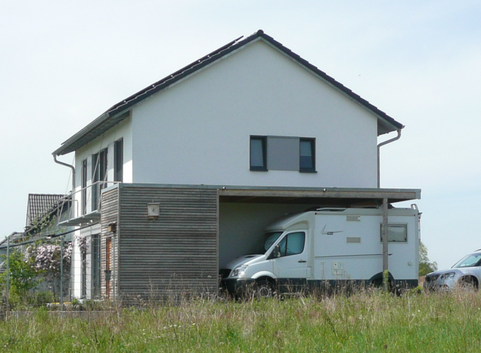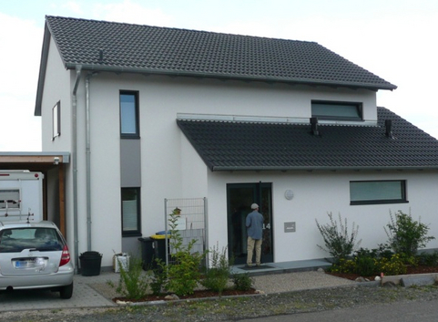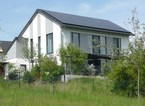 Das Passivhaus liegt an einem leichten Hang in reiner Südlage, die große PV-Anlage auf dem 30 Grad Süddach macht es zum Plus-Energie-Haus (ca.85%Einspeisung, ca.15% Eigenverbrauch)