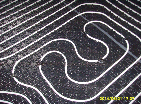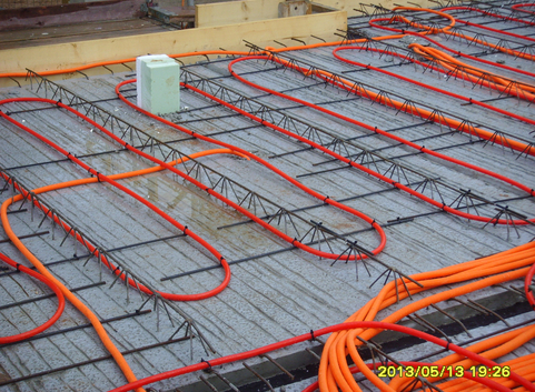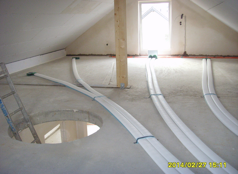 Unter der Stahlbetonplatte wurden 20 cm extrudiertes Polystyrol XPS (WLG 038) verlegt. Nach oben hin wurde mit 7 cm Polystyrol EPS (WLG 035) gedämmt. Der U-Wert der Bodenplatte beträgt 0,131 W/(m²*K).