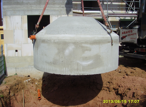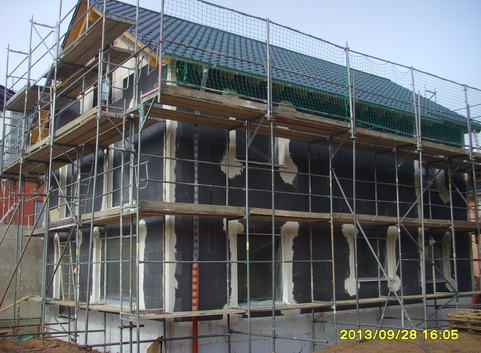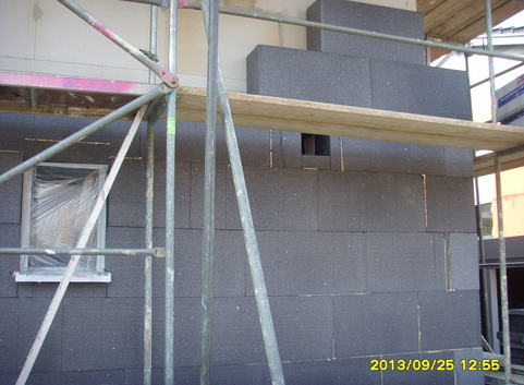 Die Außenwände wurden aus 17,5 cm starken Kalksandsteinen gemauert und mit 30 cm Polystyrol EPS (WLG 032) gedämmt. Der U-Wert der Außenwand beträgt 0,103 W/(m²*K).