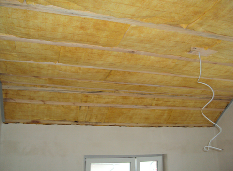 Die Holzkonstruktion der obersten Geschossdecke wurde mit 24 cm Mineralwolle (WLG 032) ausgefacht und zusätzlich mit 5 cm dicken PUR-Hartschaumplatten (WLG 024) verkleidet. Der U-Wert der obersten Geschossdecke beträgt 0,12 W/(m²*K).