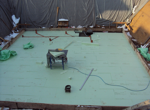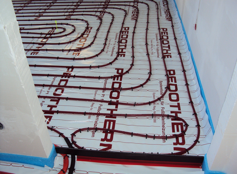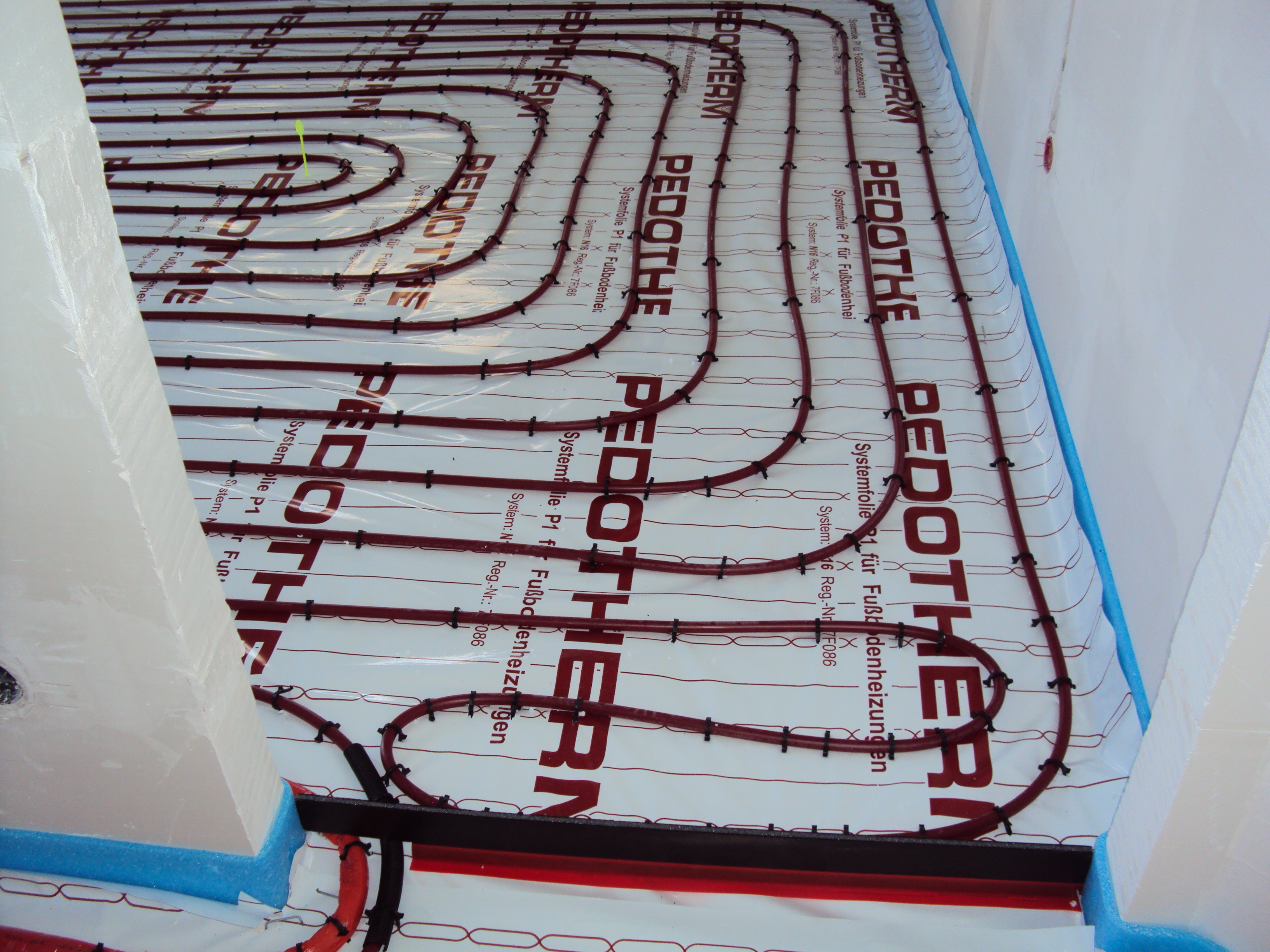 Unter der 25 cm dicken Stahlbetonbodenplatte wurden 12 cm Polystyrol EPS (WLG 035) verlegt. Oberseitig wurde mit 2 cm Polystyrol EPS (WLG 045) sowie 10 cm PUR-Hartschaum (WLG 024) gedämmt. Der U-Wert der Bodenplatte beträgt 0,126 W/(m²*K).
