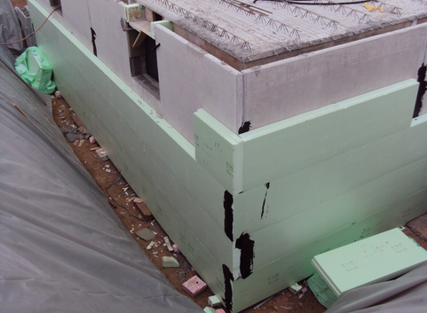 Die Stahlbeton-Kellerwände wurden außenseitig mit 10 cm Polystyrol EPS (WLG035) verkleidet. Der U-Wert der Kellerwände beträgt 0,27 W/(m²*K).
