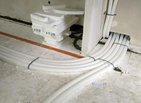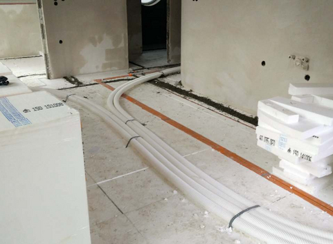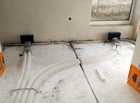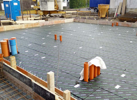 Unter der Bodenplatte wurden 12 cm Foamglas (U-Wert 0,042 W/m²*K) ausgelegt. Zudem wurden zwischen der Bodenplatte und dem Estrich weitere 22 cm EPS Platten (U-Wert 0,035 W/m²*K) montiert. Die Gesamtdicke der Bodendämmung beträgt 34 cm.