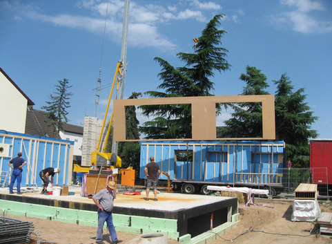 Die Außenwände des Gebäudes bestehen aus einem 36 cm starken Holzständerwerk, dass mit Holzfaserdämmplatten (WLG 040) ausgefacht ist. Die Konstruktion ist von innen mit 4 cm starken Holzfaserdämmplatten (WLG 040) gedämmt. Außenseitig mit mit 6 cm starken Holzfaserdämmplatten (WLG 047) beplankt. Der U-Wert der Außenwand beträgt 0,107 W/(m²*K).