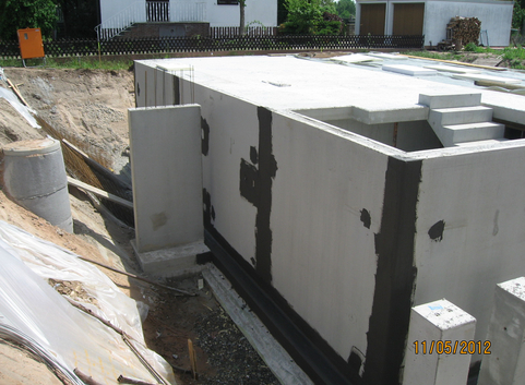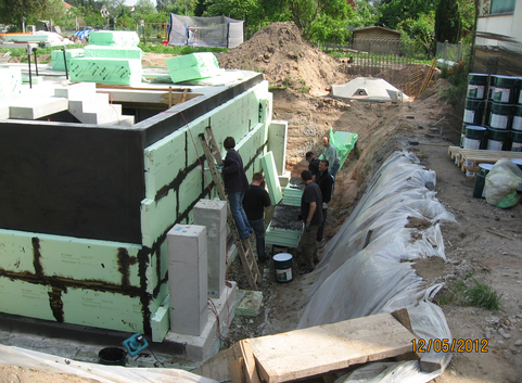 Die Kellerwände aus 20 cm Stahlbeton sind außenseitig mit 24 cm Polystyrol PS-Partikelschaum (WLG 038) verkleidet. Der U-Wert der Kellerwände beträgt zwischen 0,15 W/(m²*K).