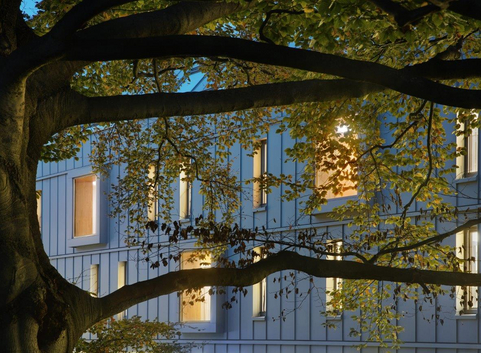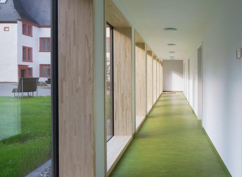 Für die Außenwände an der Südwestseite (Richtung Kirche) wurde folgender Schichtaufbau verwendet: Gipskartonplatte 2-fach - Dämmung 040 - Gipsfaserplatte 18 mm - Gipsfaserplatte fermacell vapor (15 mm) - Dämmung 035 - Gipsfaserplatte (15 mm) Außenwand: Gipsfaserplatte (18 mm) - Gipsfaserplatte fermacell vapor (15 mm) - Dämmung 035 - Gipsfaserplatte (15 mm) Die Giebelseiten sind als massive Außenwand, Stahlbeton innenliegend, dann die Dämmung 035 und Beton außenliegend, ausgeführt. Die Außenwand der Treppenhäuser weist jeweils eine außenliegende Dämmung 035 über Stahlbeton auf.