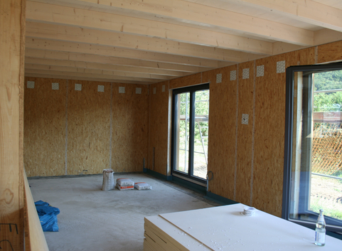 Die Außenwände wurden in Holzrahmenbauweise, einschalig, ohne Installationsebene ausgebildet. Die Holzrahmenelemente wurden dazu aus Konstruktionsvollholz hergestellt und mit einer 24 cm starken Zellulosedämmung (WLG 040) verfüllt. Zusätzlich wurde außenseitig eine 6 cm dicke Holzfaserdämmplatte (WLG 055) aufgebracht. Der U-Wert der Außenwand beträgt 0.15 W/(m²*K).