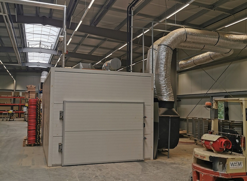 Zur Trocknung der von der WEM produzierten Lehmplatten wird Prozesswärme benötigt. Diese Wärme wird durch ein BHKW in Kombination mit einer Gastherme bereitgestellt. Die Abluft aus dem Trockenofen wird über einen Wärmetauscher geführt, mit dem die Zuluft vorgewärmt wird. Weitere Energie wird der Luft durch eine Wärmepumpe entzogen, dabei kondensiert der in der Abluft enthaltende Wasserdampf und gibt auch die latente Wärme wieder frei. Diese rückgewonnene Wärme wird in einem 5.000 l Pufferspeicher zwischengelagert und größtenteils wieder zur Trocknung verwendet. Übrig bleibt ein Teil der Abwärme auf einem sehr geringen Temperaturniveau (<35°C), die für die Trocknung nicht mehr nutzbar ist. Diese Energie wird zur Gebäudeheizung verwendet.