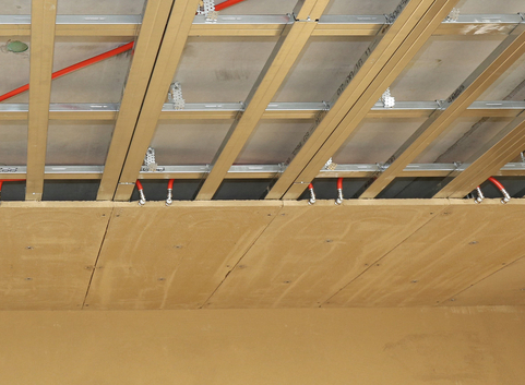 Um mit dieser niedrigen Heizmitteltemperatur auszukommen, sind Flächenheizungen zur Wärmeverteilung notwendig. In der Produktions- und Lagerhalle wird die Wärme über die aktivierte Bodenplatte eingetragen. Die Büroräume werden komplett über Deckenheizungen aus Lehmplatten mit integrierten Heizleitungen versorgt.