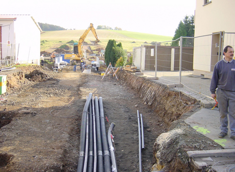 - Das Nahwärmenetz innerhalb des Neubaugebiets wurde in PE-Rohr erstellt. In den Gebäuden befinden sich je nach errechnetem Wärmebedarf eine Übergabestation mit bis zu 40 kW Leistung für die Heizungs- und Warmwasser-Versorgung.