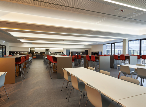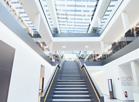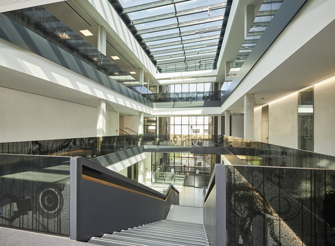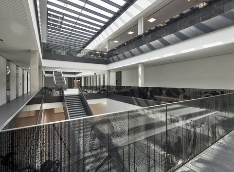 - Aluminium-Pfosten-Riegel-Konstruktion mit Dreischeiben-Wärmeschutzverglasung (UG-Wert unter 0,5 W/(m²K))