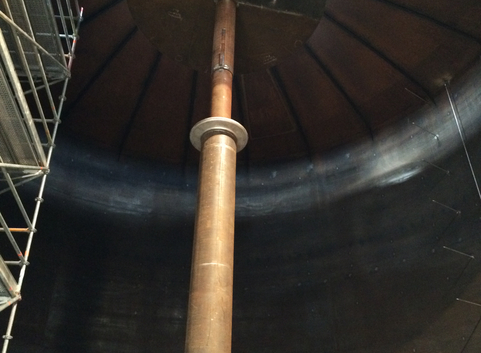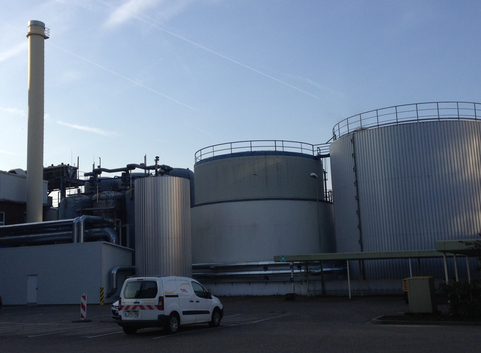 Ein alter nicht mehr benötigeter Heizöltank mit einem Volumen von 1200 m³ wurde zu einem Warmwasserspeicher umgebaut. Wichtig hierbei ist, eine thermische Schichtung des gespeicherten Wassers zu erzielen, da nur so das gesamte Volumen als Speicherleistung zur Verfügung steht. Dies wird durch einen speziell angefertigten Düsenring erreicht, der auf der Wasseroberfläche schwimmend immer eine optimale Wärmeschichtung ermöglicht. Der Speicher ist drucklos ausgelegt und kann daher mit Temperaturen bis 99 C° beaufschlagt werden. Die Ein- und Auslagerung erfolgt vollautomatisch. Es muss nur die gewünschte Leistung eingegeben werden, alles andere übernimmt die Steuerung. Durch den Verzicht auf Wärmetauscher kann der Wirkungsgrad nochmals gesteigert werden, da die Wärmeverluste durch die Wärmetauscher entfallen. Zum Einsatz kommen anstelle dessen kombinierte Druck- und Mengenregelventile, die auch für die Sicherheitsabschaltung bei Übertemperatur und Überdruck übernehmen. Durch spezielle hydraulische Schaltungen in der Übergabestation können die Pumpen sowohl zum Be- als auch Entladen eingesetzt werden. Hierdurch konnte eine komplette Pumpengruppe eingespart werden.