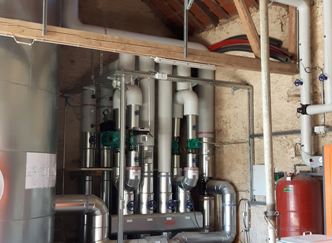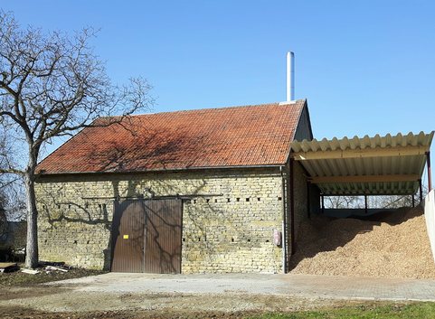 Errichtet wurde ein Kesselhaus mit einem 40 m³ Pufferspeicher, einem 500 kW Holzhackschnitzelkessel und einem Hackschnitzelbunker . Das Holz stammt von Händlern aus der Region und teilweise auch aus dem Gemeindewald. Durch die Trocknung in der eigenen separaten Biogasanlage können direkt Trocken-Hackschnitzel eingesetzt werden.